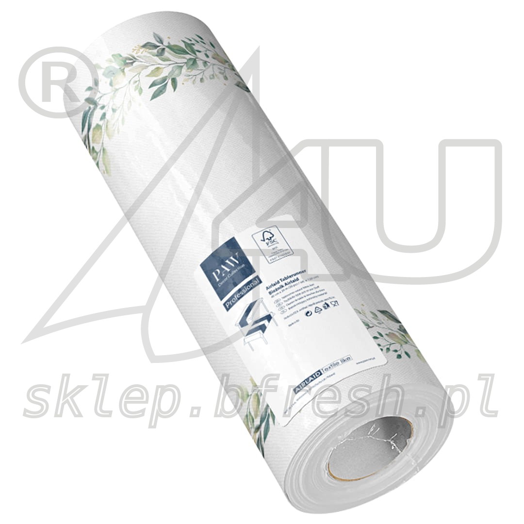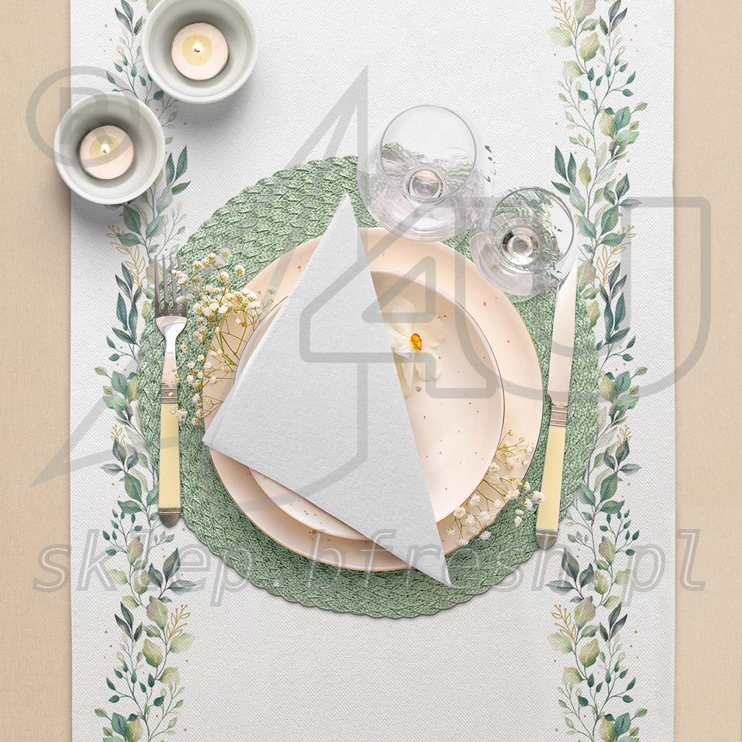 Bieżnik Eukaliptusowe Liście z flizeliny na wesele sprawdza się również idealnie jako bieżnik komunijny. Wykonany jest z wysokogatunkowej bibuły airlaid. Charakteryzuje się miękkością i strukturą przypominającą podobne produkty z naturalnych materiałów włókienniczych. Perforacja co 120 cm, umożliwia szybki i wygodny podział bieżnika na dowolnej długości nakrycia, dostosowane do długości stołów.