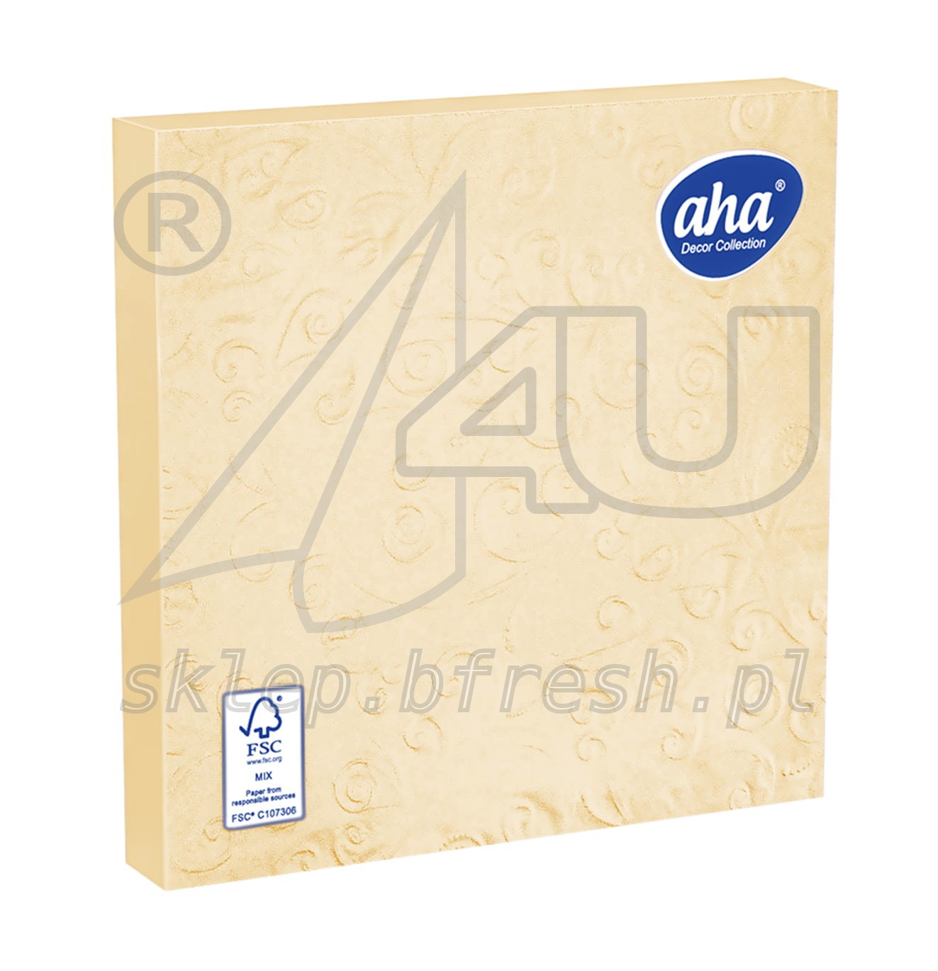 Serwetki z tłoczonym ornamentem 33 x 33 cm, 3 warstwowe o lekko połyskującej powierzchni, renomowanej marki AHA, produkowane przez firmę Hanke Tissue. Wykonane są z najlepszej jakości bibuły o 100% zawartości celulozy. Posiadają certyfikat PZH. To najlepszy wybór dla wszystkich, którzy cenią wysokie standardy.