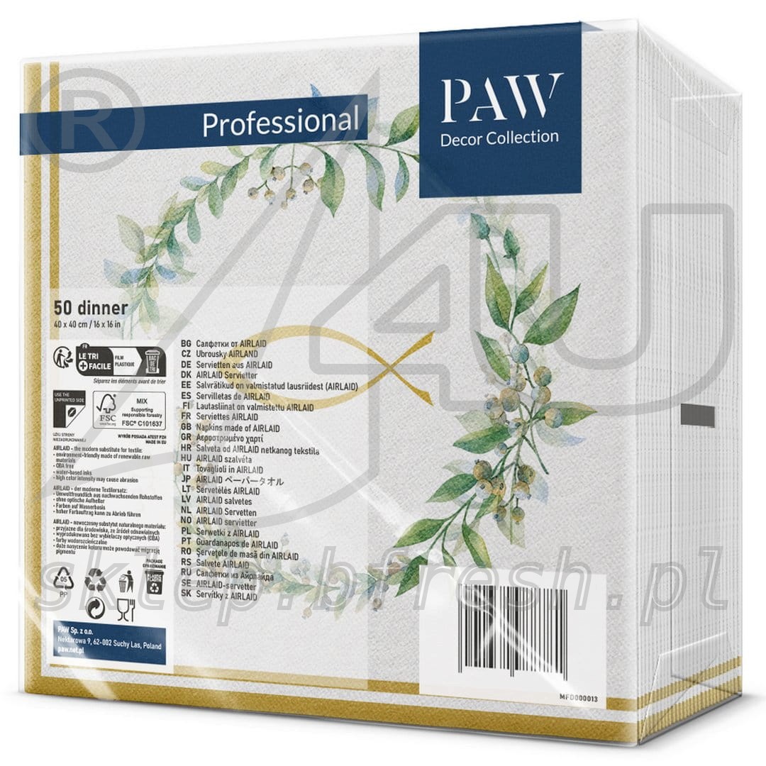 Serwetki na komunię Symbol Ryby z Eukaliptusowym Wiankiem, wykonane z wysokogatunkowej bibuły airlaid, charakteryzują się miękkością i strukturą przypominającą serwetki bawełniane. Ze względu na swoje właściwości, pozwalające na formowanie z nich dowolnych kompozycji oraz estetykę, serwetki Pierwsza Komunia Ryba z Wiankiem są doskonałą alternatywę dla tradycyjnych serwetek materiałowych. Dzięki temu cieszą się dużym uznaniem wśród użytkowników.